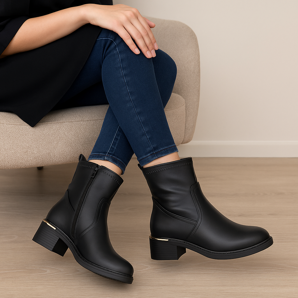 Bottines à talon confort et touche dorée – plus axé confort et style quotidien.