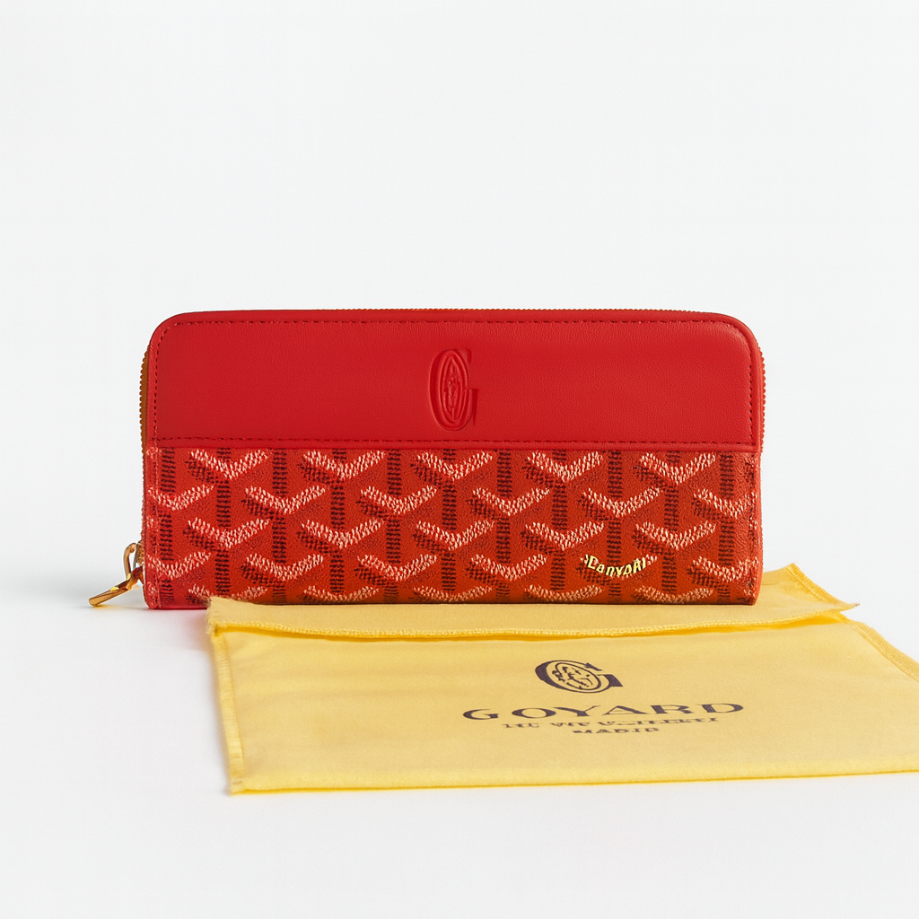 Portefeuille Goyard au motif iconique, alliant élégance et praticité. Un accessoire de luxe raffiné avec fermeture zippée et compartiments bien pensés pour un usage quotidien.