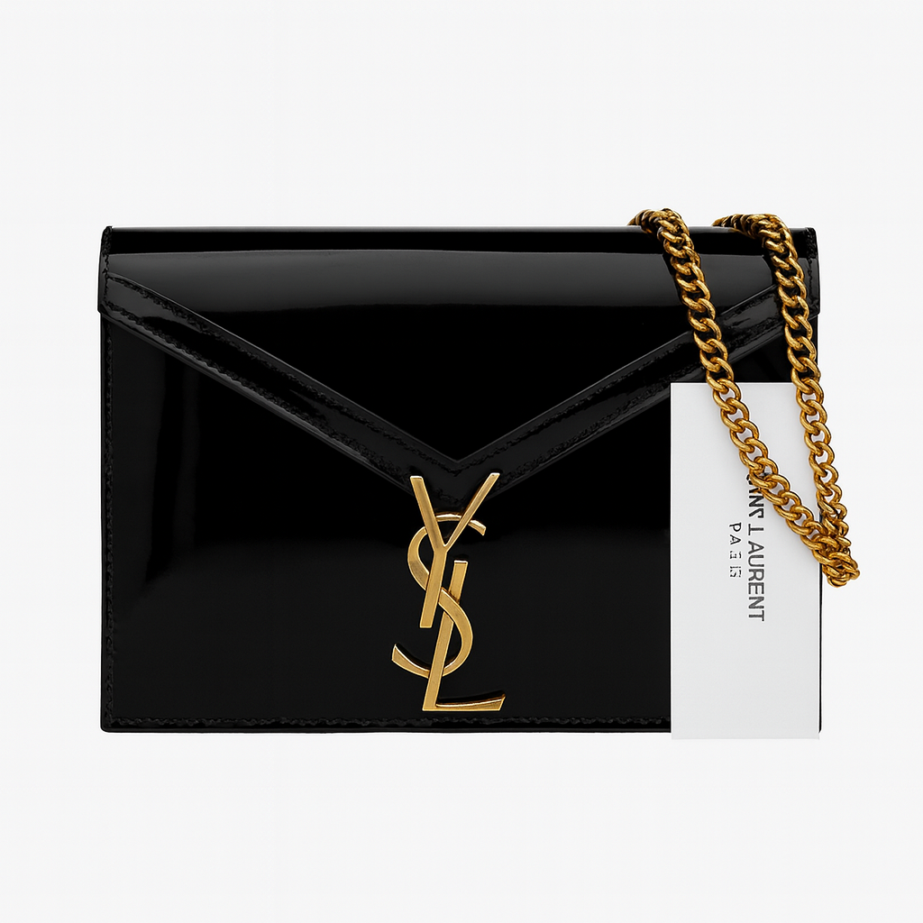 Sac raffiné en cuir verni au design enveloppe, orné du logo métallique iconique et d’une chaîne dorée élégante. Compact et pratique, il offre assez d’espace pour vos essentiels tout en apportant une touche chic à toutes vos tenues